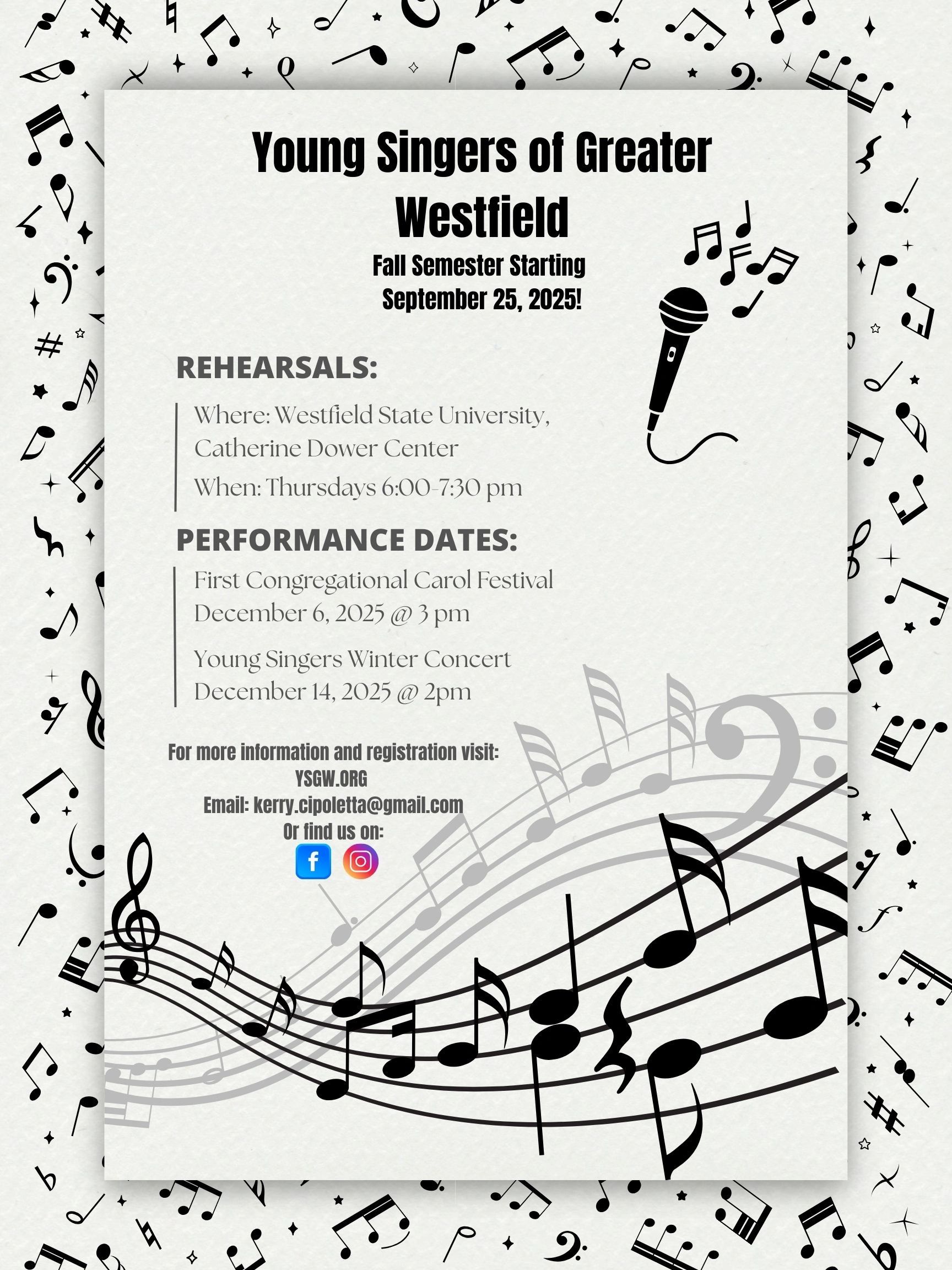 Young Singers of Greater Westfield will bring together students grade 5-8, who rehearse weekly to develop vocal skills, musical literacy, and a beautiful choral sound.